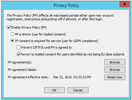 Select the Enable Privacy Policy check box, then specify whether the agreement is implied or required for service. If the agreement is required, you can select the Prevent check box to prevent access over FTP, SFTP, or FTPS until the Privacy Policy agreement is accepted. The Revert to implied consent for users identified as not being EU data subjects is selected automatically.