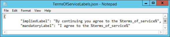 The TermsOfService agreement and TermsOfServiceLabels files are JSON files (similar to XML) that must be edited for your organization's agreement. (The labels in the JSON file are case-sensitive.)