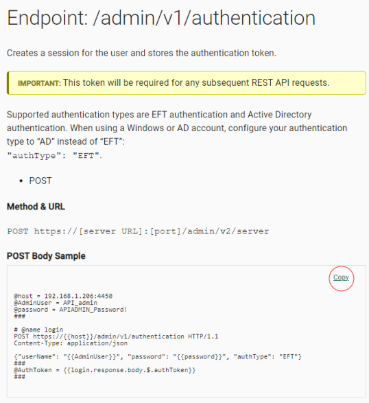 The EFT REST API reference HTML version contains all of the endpoints with a "Copy" link in each code block (circled in red below) so that you can easily copy the code to paste into PowerShell, Visual Studio, and other editors.