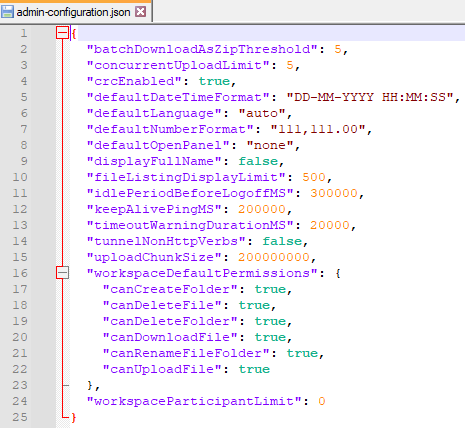 The admin-configuration.json file provides several default settings, shown below with the defaults. The default location of the file is: