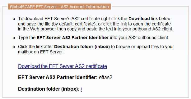 EFT provides an AS2 Web page at the reserved path of /as2. On this page, partners can access the following information: