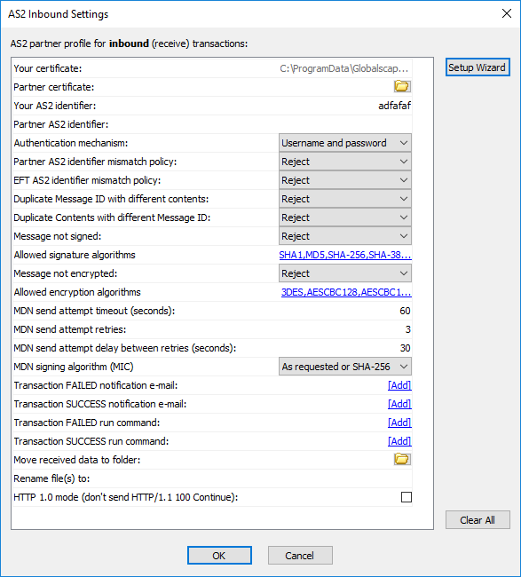 | Partner AS2 identifier | Required | Your partner's AS2 identifier (must be unique). |