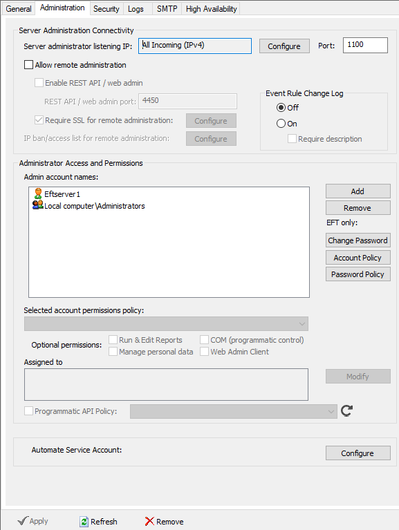 The Administration tab of the Server node is used to configure remote connections to EFT, including the administration interface's IP address and port, SSL certificates, and granting or denying access by IP address, and adding, modifying, and removing Server administrator accounts.