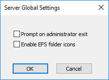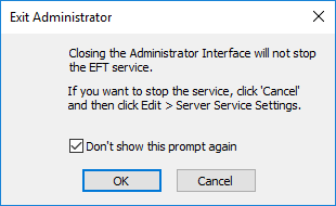 The Prompt on administrator exit check box is cleared by default. If you want a message to appear when you close the interface explaining that the EFT service does not stop after the administration interface is closed, select the Prompt on administrator exit check box.
