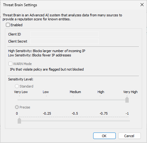 When Threat Brain is not configured or enabled (for example, Client ID/Secret are missing), WARN mode controls are unavailable (dimmed).