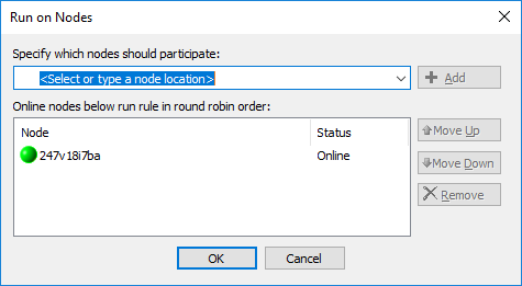 Next to the Default Primary Event Rule Load Balancing and Default Backup Event Rule Load Balancing, click Edit. The Run on Nodes dialog box appears.