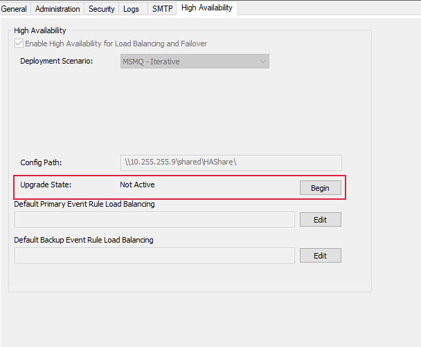 Upgrade State—If you are upgrading the cluster, click Begin to put EFT in read-only mode to begin the upgrade process. The button will display End when the upgrade has completed. During upgrade, Upgrade State will display “Active; Outdated; x.x.x.x”, where x.x.x.x is the current EFT version.