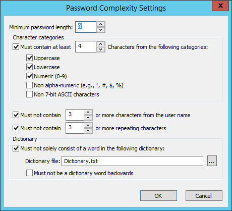 12. Select the Must not be dictionary word backwards to ensure the password is not a word in the dictionary file spelled backward.