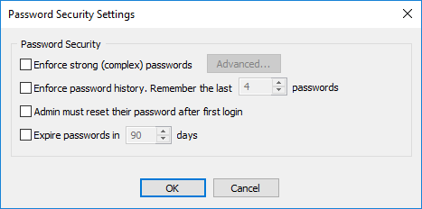 7. To specify password complexity settings, click Advanced. The Password Complexity Settings dialog box appears.