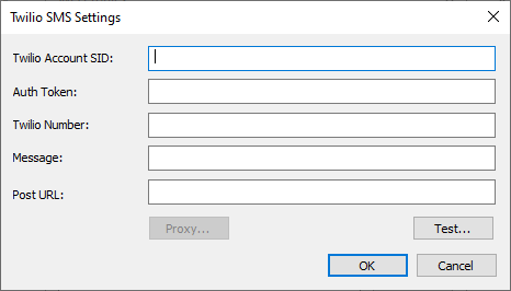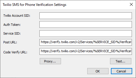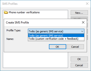In the Profile Type list, specify either Twilio (as generic SMS service) or Twilio (custom verification code + feedback) then click OK. Depending on which one you chose, the Twilio SMS Settings or the Twilio SMS for Phone Verification Settings dialog box appears.