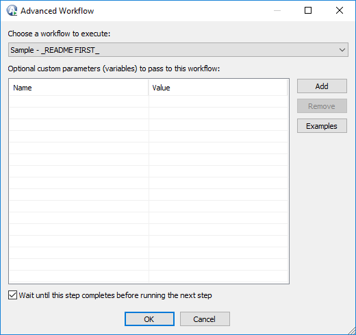 (Optional) Specify custom parameters to pass to the Workflow in the Name and Value columns, and then click Add.