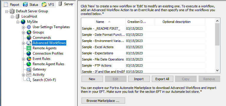 The Advanced Workflow module adds additional automation capabilities to the EFT Event Rules system, allowing you to add scripting and variables to Workflow Tasks, then add these reusable Workflows to Event Rules. A Workflow is a series of steps that can perform file transfers, batch data processing, application testing, and so on, and are defined to run automatically when started by some event. The Advanced Workflow module is built on components of the Automate Desktop product from Fortra. EFT Event Rules use the Automate Task Builder and Actions, but not the Automate Task Administrator. Instead of the Automate Task Administrator, events and triggers are managed by the EFT Event Rules system.