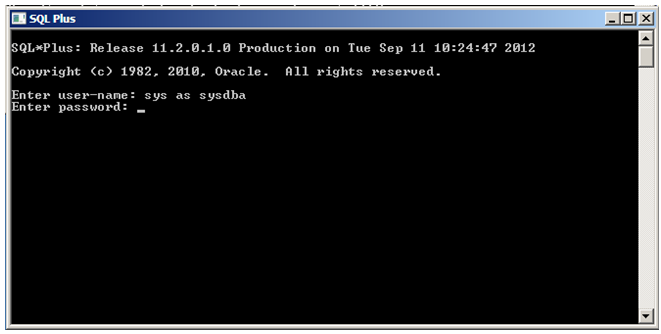 Once SQL Plus has started, you will be prompted for login credentials. Connect using a privileged account such as "sys" or "system". Be aware that when connecting as the "sys" account you must provide the "as sysdba" option; for example: