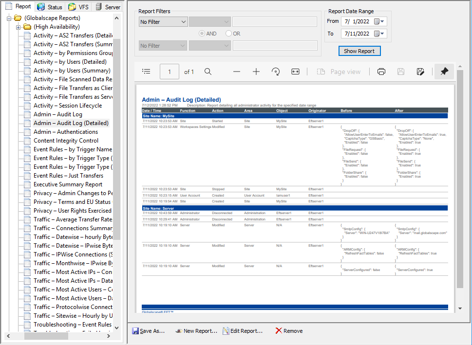 Refer to Descriptions of Preconfigured Reports for descriptions of the report templates in the Globalscape Reports node of the tree.