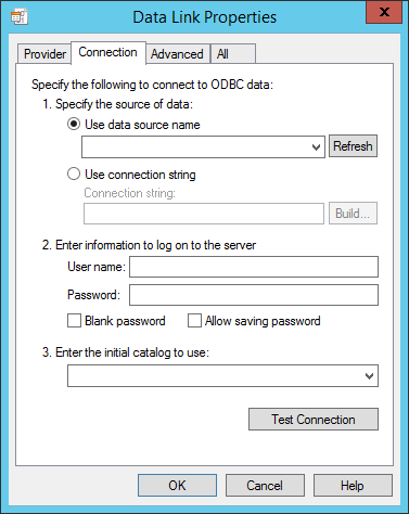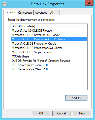 In the OLE DB Provider(s) list, click the data source server (for example, Microsoft OLE DB Provider for ODBC Drivers), and then click Next. The Connection tab appears. What appears on the Connection tab depends on the OLE DB Provider selected.