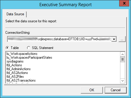 The box below the ConnectionString displays the table or SQL Statement used to populate the report.