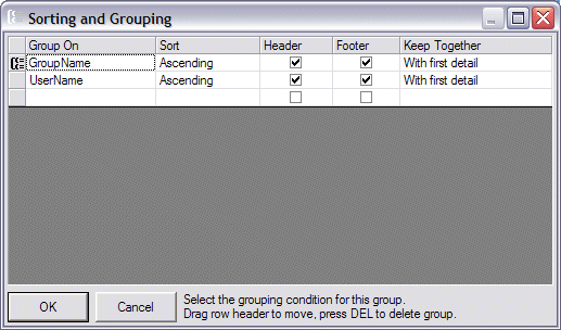 After you enter some data for the first group, a new blank row is appended to the list, so you can keep creating new groups. If you add more groups, you can change their order by clicking on the left-most gray cell in the row and dragging the row to a new position. This will automatically adjust the position of the Group Header and Footer sections in the report.