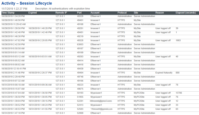 NOTE: If an EFT user connects to EFT using CuteFTP over HTTPS and uploads several files, the report does not include data in the Expired (logout time), Reason, or Elapsed columns.)