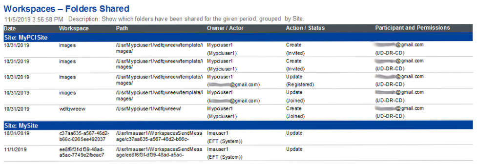 Workspaces - Folders Shared - This report shows which folders have been shared for the given period, grouped by Site, organized by Date, Workspace, Path, Owner/Actor, Action/Status, and Participant/Permissions.