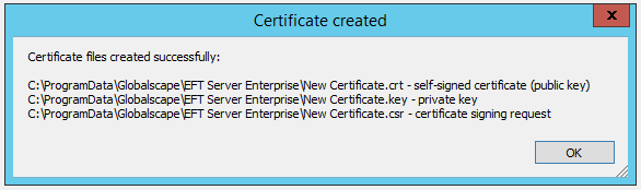 For maximum compliance with security standards, you should use a trusted authority signed SSL certificate. You can import certificates or use this wizard to create your own. The private key (.key) and certificate request (.csr) files are created at the same time. You are prohibited from creating certificates for EFT while remotely administering EFT because this Action can create a security breach. Any certificates you create remain on the computer on which you create them, unless you take special steps to deliver and associate these files with another computer.