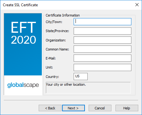 A certificate on the client must be associated with EFT to initiate an SSL connection. When you are administering EFT on the local computer, you can import your own certificates or create new ones using the Certificate Creation Wizard (described below).