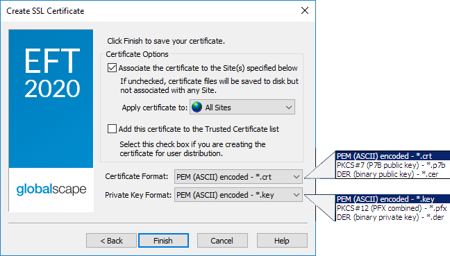In the Apply certificate to box, specify which components of EFT are affected (administration Service, All Sites, or a specific Site).