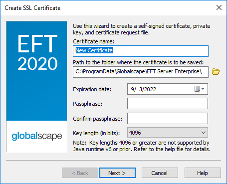 The Certificate Creation Wizard does not create SHA-2 certificates; however, EFT can apply a SHA-2 certificate generated through other means, like certificate authorities and third party applications.