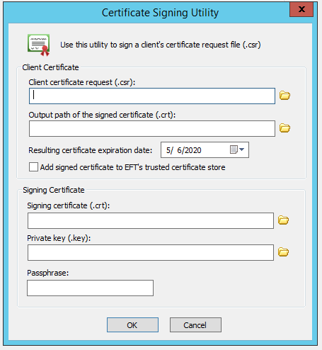 EFT can sign certificate requests created by other clients. Typically, the client certificate request is signed with the certificate created for EFT. If a certificate from the FTP server's Trusted Certificates database is used to sign client certificates, then all certificates you sign are automatically trusted.