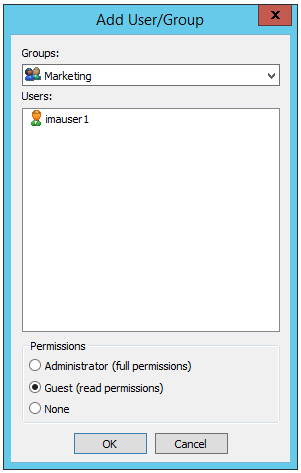 In the Permissions area, click one of the permissions: administrator, Guest, or None, then click OK. The user or group appears in the Permissions pane.