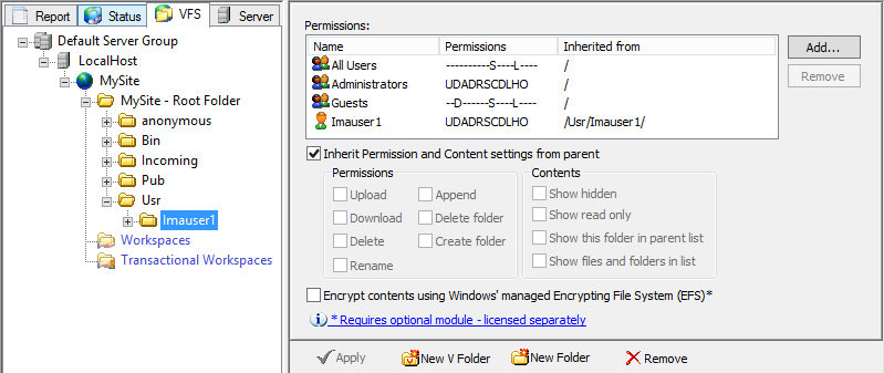 You can add a user or Group to existing permissions on the VFS tab's Permission pane. The All Users, Administrators, and Guests Groups are default Groups created by EFT during installation. You can create other Groups on the Server tab. Refer to Permission Groups for more information about Groups. (You must create the user or Group on the Server tab before you can add it to VFS permissions.)