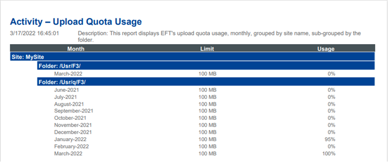 The EFT administrator can specify an upload quota for virtual folders. The quota applies across clusters and applies to all protocols.