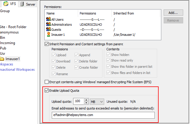(EFT Arcus v8.1.1.13 and later) Unlike User quota, Upload quota is set at the VFS folder level and is measured based on traffic into the VFS folder, not the size on disk. Upload quotas can be configured at the root level or subfolder, but not both. The upload quota is then inherited to subfolders. Upload quota is specific to the transfers that occur into the server. Additionally, it is not based on a per user transfer and instead collectively captures the quota for the VFS folder via the various protocols.