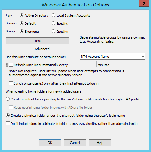 When you created the Site, you specified either Active Directory or Local System Accounts. If you need to change this, click the appropriate option to match the authentication method used on EFT's domain. Authentication is done with the LogonUser() function. The operating system determines which method to use for authentication, such as Kerberos, NTLM2, etc.