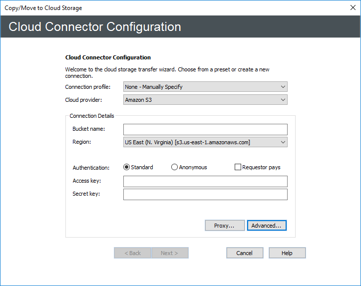 The Upload and Download file to cloud storage Actions are used when you want to copy, move, or download files to/from Amazon S3 or Azure Blob storage. The Cloud Connector Configuration page in the Action wizard allows you so specify the cloud provider storage and other details, based on whether you specify Amazon S3 or Azure Blob storage.