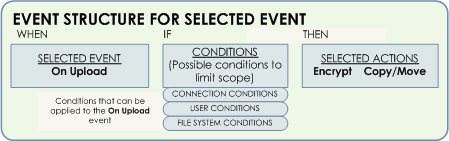 In an Event Rule, when a selected event occurs (for example, a file is uploaded to EFT), if the specified Condition exists (for example, user is member of group A), then the selected actions occur (for example, encrypt the file).