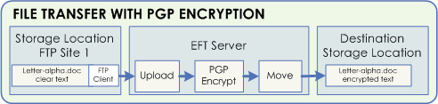 Below is a simplified example of the file transfer process in which EFT uses OpenPGP to encrypt uploaded data and the off-load capabilities of EFT to move the file to another location.