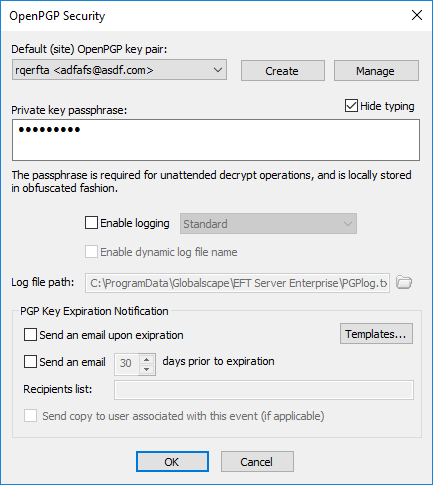 If an OpenPGP key pair is defined on EFT, click the Default Site key pair drop-down menu and click the key. Otherwise, click Create and follow the instructions in Creating Key Pairs for OpenPGP or click Manage and following the instructions in Importing and Exporting Key Pairs for OpenPGP.