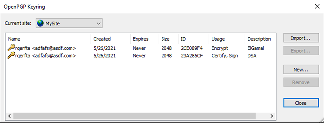 Use the OpenPGP Keyring manager to create, delete, import, and export OpenPGP key pairs.