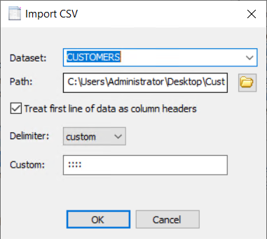 In the CSV import to dataset dialog box is used to specify the source CSV file (Click the file icon and click the file that you want to import). In this way, you can create and populate a dataset. Advanced options allow you to treat the first line of data as column headers and specify the delimiter format (comma, semicolon, tab, space, or custom). Comma is the default.