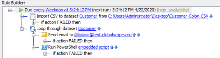 When a dataset is created, the current row is automatically set to 1 (assuming that the dataset has any data, since it is possible for a dataset to have 0 rows, such as when a SQL Query returns no data). A dataset is of minimal use, however, unless one can access the other rows. Typically, this is accomplished by using the Loop through Dataset action, which takes a dataset name as a parameter and automatically increments the current row with each iteration. The loop continues until all the rows have been accessed. In this way, you could make a task that performs operations on each row of the dataset while using the same expression. For example: %Customers.Email%.