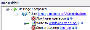 Using the Event Rule defined below, when a user who is not a member of the Administrators group defines a message in the Send portal and attempts to send a file, the file is blocked or redacted and an error is written to the Windows Event Log.