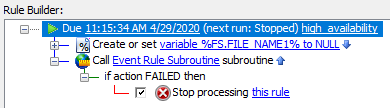 Folder Monitor and Timer Rules are not ordered, because there is only one Rule corresponding to a specific Folder Monitor/Timer ("one Event - one Rule" correspondence); only "Stop processing this Rule" is available for them. Certain "server-wide" Events ("Monitor Folder Failed," "Service started," "Service stopped," "Log rotated") allow "Stop processing this Rule" behavior only.