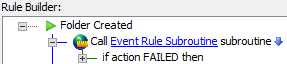 (Requires EAM) The Flow: Subroutine Action allows you to call an Event Rule Subroutine event (a sub task) from the current rule. The primary purpose of the Subroutine action is to help you break up larger rules into smaller, reusable ones. Obviously, you would have already created other rules to call. These sub tasks would be rules that you commonly use, such as sending email notifications, moving files, encrypt/decrypt, and so on. (See below for behavior.)