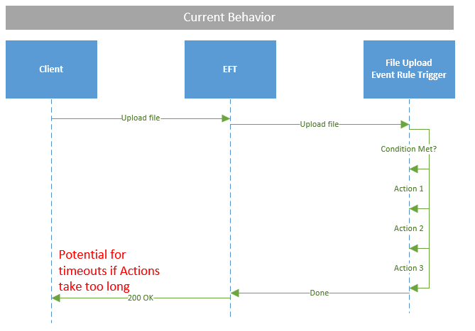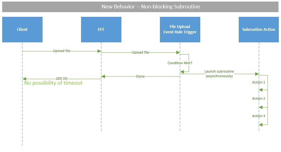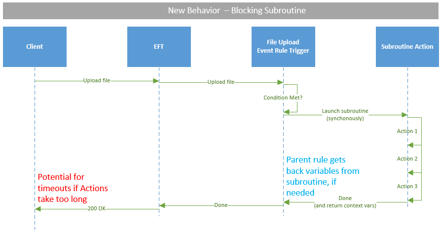 While the primary purpose of the Subroutine action is to help you break up larger rules into smaller, reusable ones, there is an additional benefit. Without the Subroutine action, rules triggered by file uploads do not return a positive completion reply to the remote client until after all actions in the rule have completed, which results in an increased risk of a client time out: