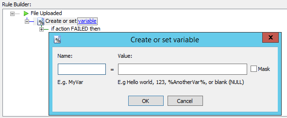 In the Rule Builder, click the variable link. The Create or set variable dialog box appears.