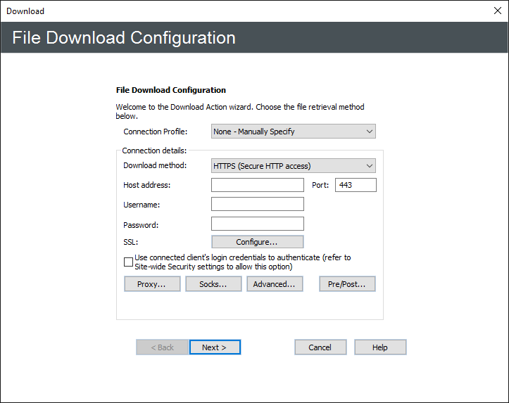 (Requires FTC module) You can configure an Event Rule to copy or download from a specific location to a specified local folder using a particular protocol when an Event occurs. You must provide EFT with connection information (protocol and login details) and file information (source path and destination path). The Download Action is available with all Events except Site Stopped and Service Stopped.