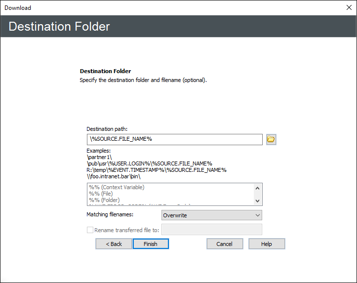 and specify the location in which to save the downloaded file. You can insert variables by double-clicking them in the box below the Destination folder box.-
