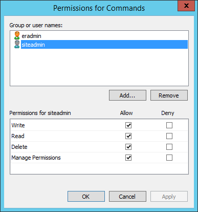 Certain delegated administrators have all permission (Write, Read, Delete, and Manage Permissions) to manage the Custom Commands. Granular permissions allow the EFT administrator to control which administrators have control over certain objects. For example, you might want to give the Site administrator permission to Manage Permissions, but give the Event Rules administrator only Read permission.