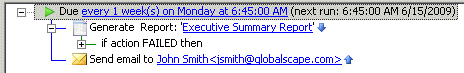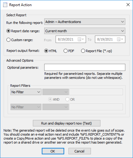 Next, you should create an email Action and include the %FS.REPORT_CONTENT% variable or create a Copy/Move Action and use the %FS.REPORT_FILE% variable to place a copy of the report on a shared drive after the report has been generated.