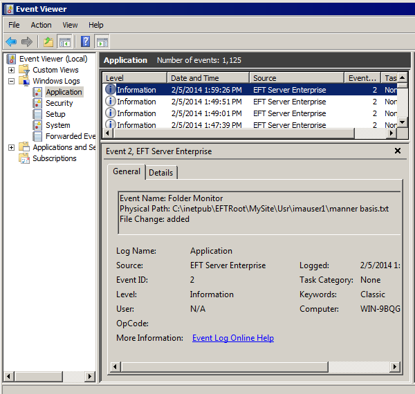 Click Windows Logs > Application. Double-click an EFT (Source) event. The General description and Details of the Event appear.